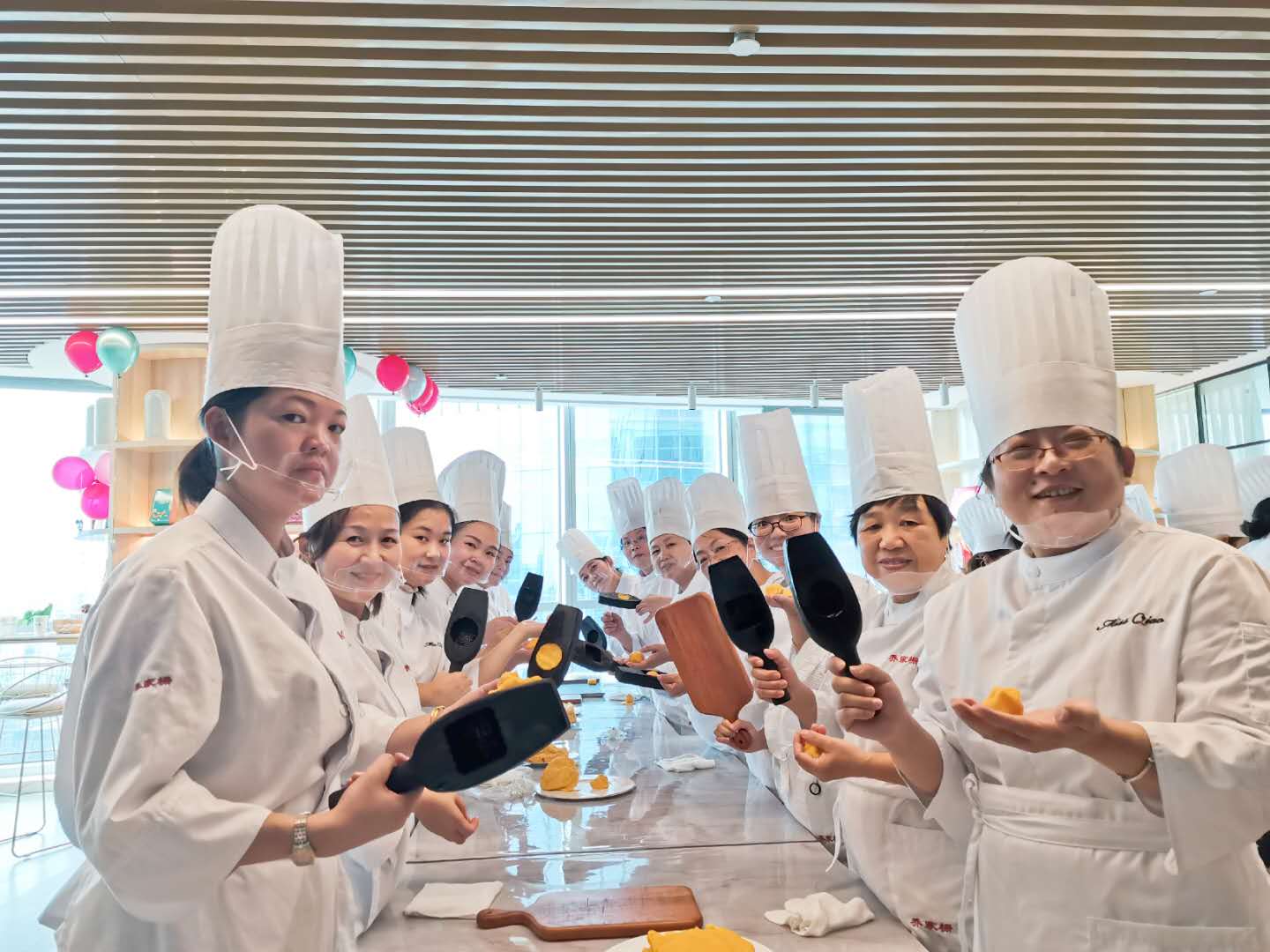 隨后,學(xué)員們動手環(huán)節(jié)將活動推向了高潮,大伙兒拿出十二分精氣神,將剛剛所學(xué)之精髓全部投入到制作流心月餅中去,將制作好的月餅陷捏成面皮狀,包入冷凍好的流心餡里面,放至模具中,擠壓成不同的月餅花式,然后放入烤箱烤制??矗蠹叶加刑锫莨媚锏娘L(fēng)采,個個都做得有模有樣,味道更是格外香甜。