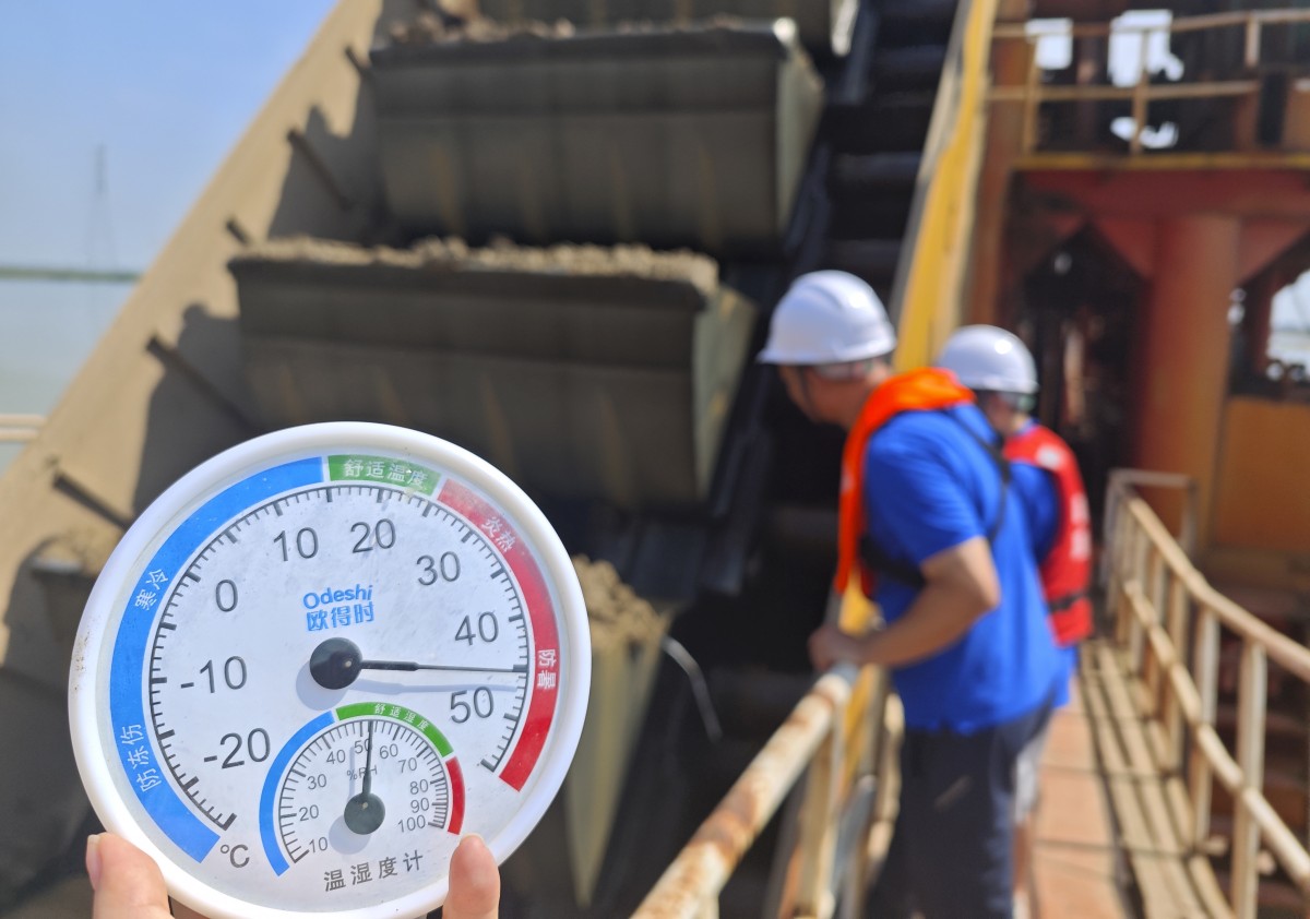 姜奇是贛昌砂石公司開采管理中心班長(zhǎng)、中共黨員,負(fù)責(zé)贛撫尾閭采砂船現(xiàn)場(chǎng)管理工作。入伏以來(lái),南昌持續(xù)高溫天氣,而采砂船上的實(shí)際氣溫更是高達(dá)40度以上,中午最高氣溫可達(dá)50攝氏度,船上不但炎熱憋悶,噪音更大,“咣當(dāng)咣當(dāng)”的機(jī)器作業(yè)聲響?yīng)q如身處沒有空調(diào)的綠皮火車車廂里。他們每天要在采砂船上工作10余個(gè)小時(shí),量船、檢查設(shè)備、查看砂質(zhì),這些工作都需要在船艙外進(jìn)行,頭頂著烈日,汗流浹背是再正常不過的事,身上的藍(lán)色工作服濕了又干、干了又濕……