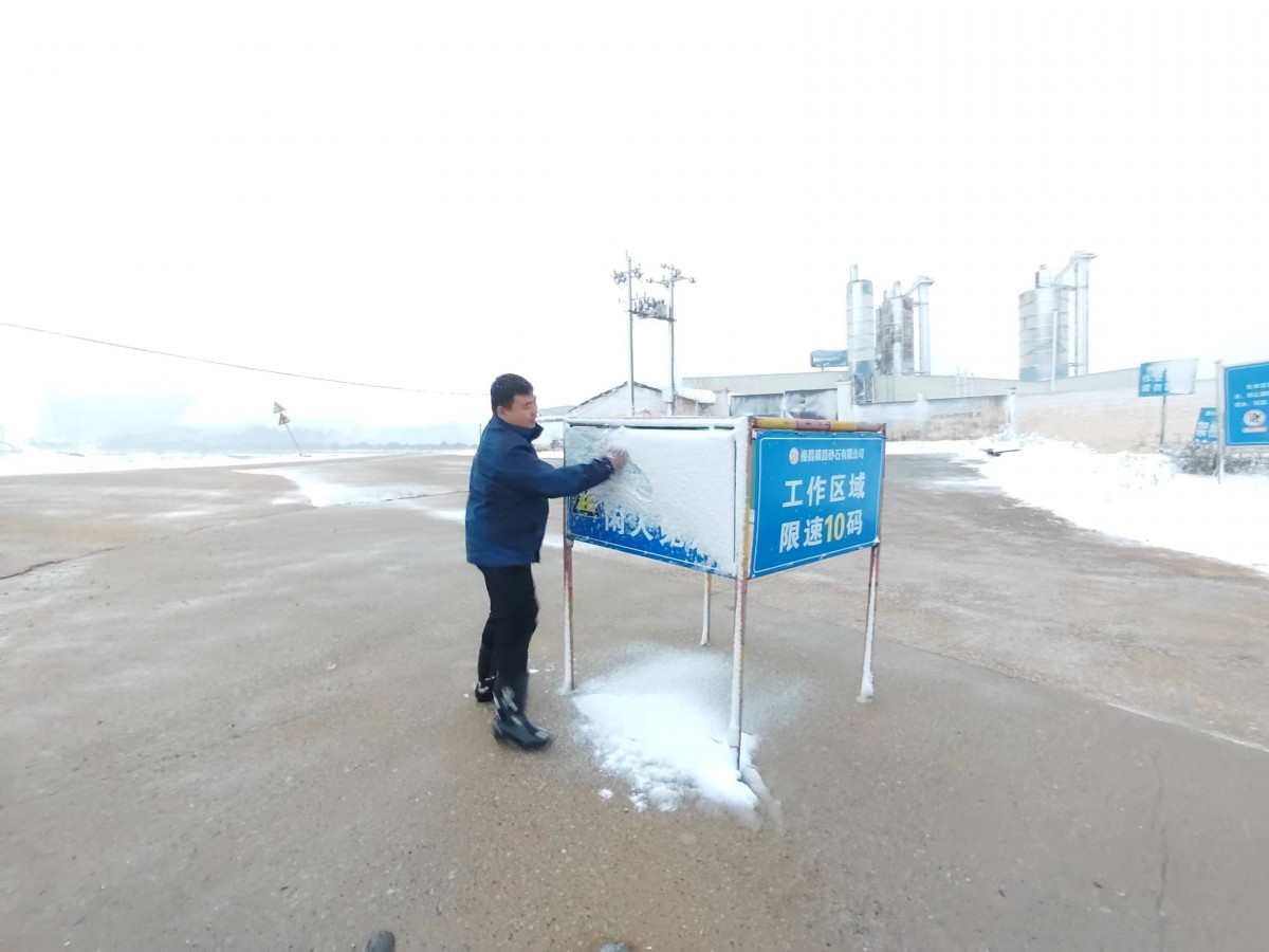 ▲砂海黨支部應(yīng)急突擊隊對廠區(qū)路面及指示牌積雪進行清理