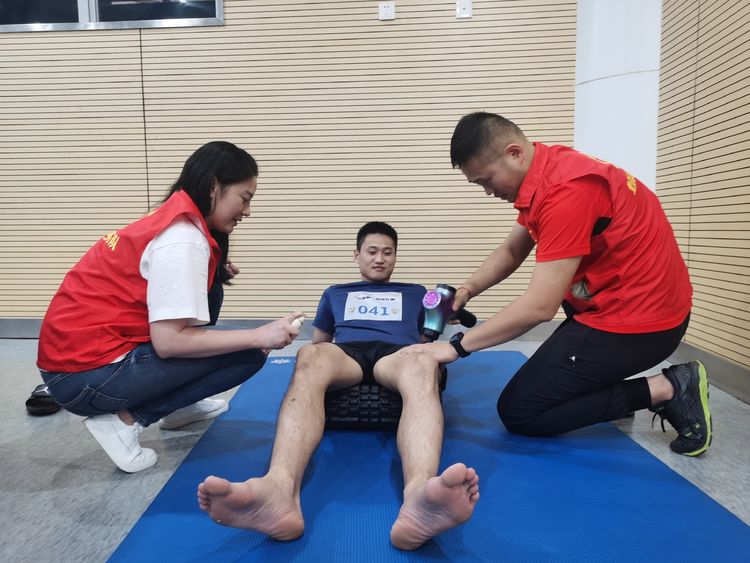 經(jīng)過賽場上的激烈角逐,大部分運動員們紛紛出現(xiàn)了肌肉拉傷、筋骨酸疼等癥狀。為緩解運動員們肌肉疲勞,能全身心投入到接下來的比賽中,在比賽間隙和中午休息期間,機關黨支部黨員和積極分子攜帶筋膜槍、泡沫軸、彈力帶以及云南白藥等物品對有需要的參賽選手通過按摩、拉伸等方式,幫助參賽選手們放松,以更好的精神狀態(tài)投入到后續(xù)的比賽當中。