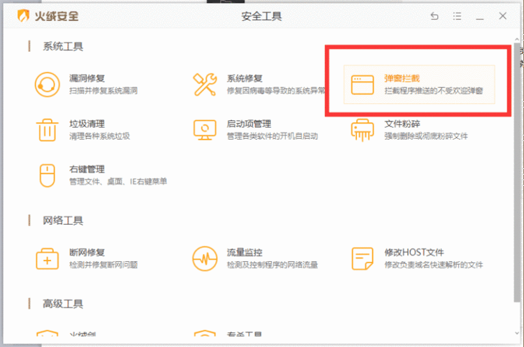 操作方法:點擊“火絨安全安全工具”后下載“彈窗攔截”,運行后廣告彈窗會變少很多。但部分廣告依然會成為漏網(wǎng)之魚,就要點擊“截圖攔截”,對具體的廣告界面進行精準(zhǔn)打擊。