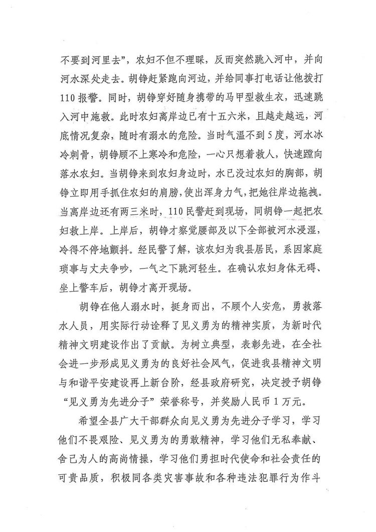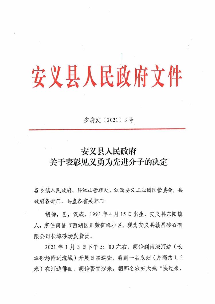 胡錚用實(shí)際行動(dòng)詮釋了見義勇為的精神實(shí)質(zhì),為新時(shí)代精神文明建設(shè)作出了貢獻(xiàn)。為樹立典型,表彰先進(jìn),經(jīng)安義縣人民政府決定,授予胡錚“見義勇為先進(jìn)分子”榮譽(yù)稱號(hào),并獎(jiǎng)勵(lì)人民幣一萬元。