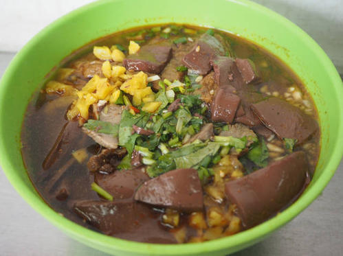 小店沒有請工人,母親帶著兒子、兒媳,一家三口終日在店里忙活。兒媳是主力,40來歲,小巧玲瓏的身材,樣貌精致,平時輕聲細語的很是和善,負責調佐料,收錢,招呼顧客。男人個子高高瘦瘦,是大廚,平常在廚房煮豬血和燙粉。別看婆婆個子瘦小,但做事很麻利,收拾碗筷,端粉、面和洗碗的活兒干起來有條不紊。