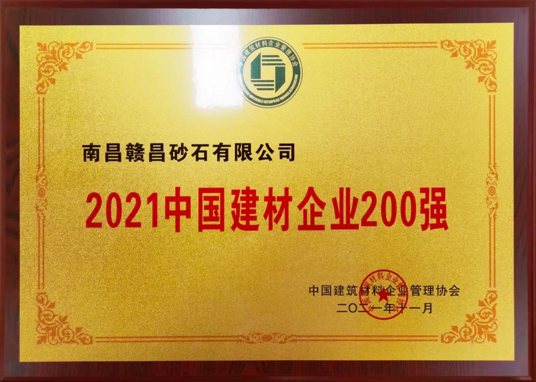 中國建筑材料企業(yè)管理協(xié)會(huì)、中國建筑材料企業(yè)管理協(xié)會(huì)品牌建設(shè)分會(huì)共同在大會(huì)上為2021中國建材企業(yè)500強(qiáng)頒發(fā)證書。南昌贛昌砂石有限公司作為500強(qiáng)企業(yè)前200名,特榮獲“2021中國建材企業(yè)200強(qiáng)”榮譽(yù)稱號(hào)。