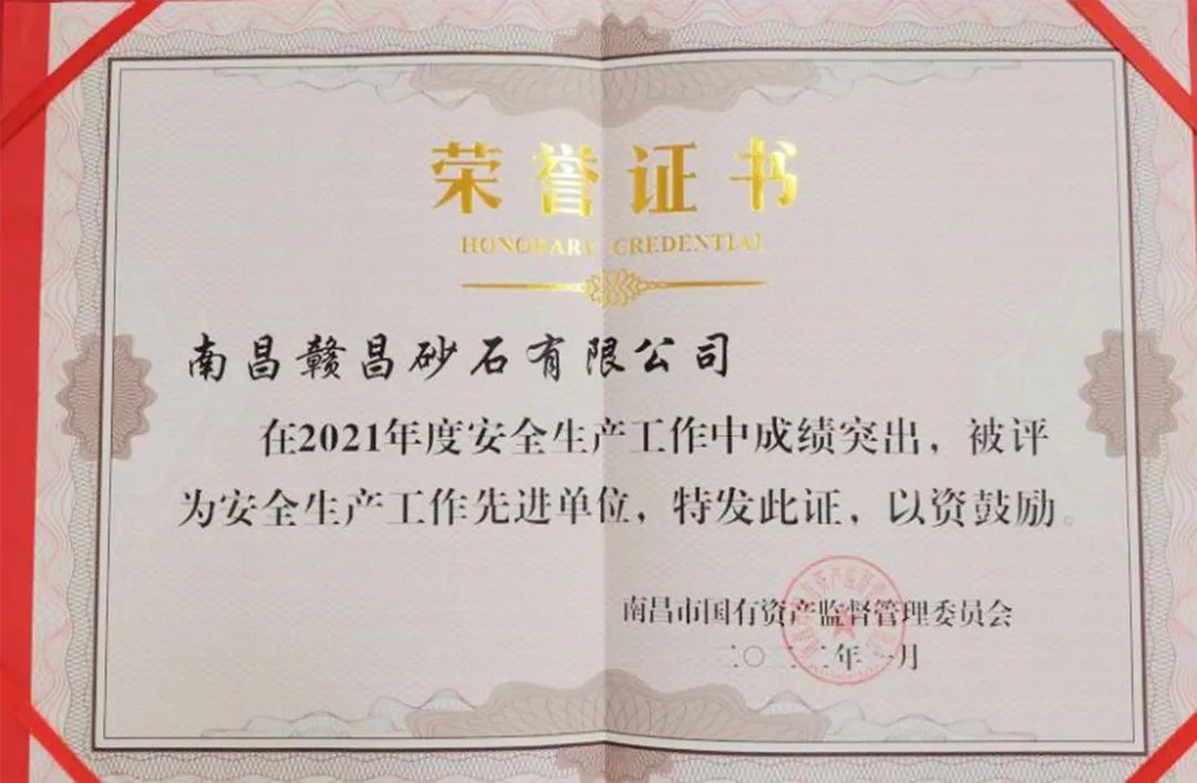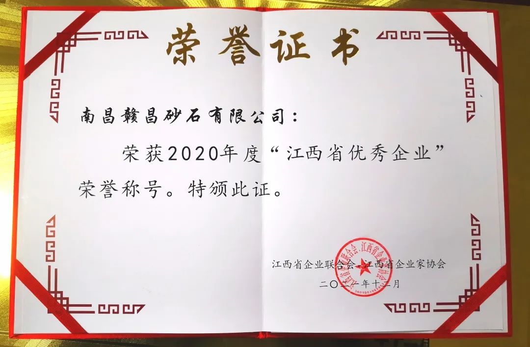 2021年贛昌砂石公司榮獲江西省企業(yè)聯(lián)合會、江西省企業(yè)家協(xié)會頒發(fā)的“2020年度江西省優(yōu)秀企業(yè)”榮譽稱號。