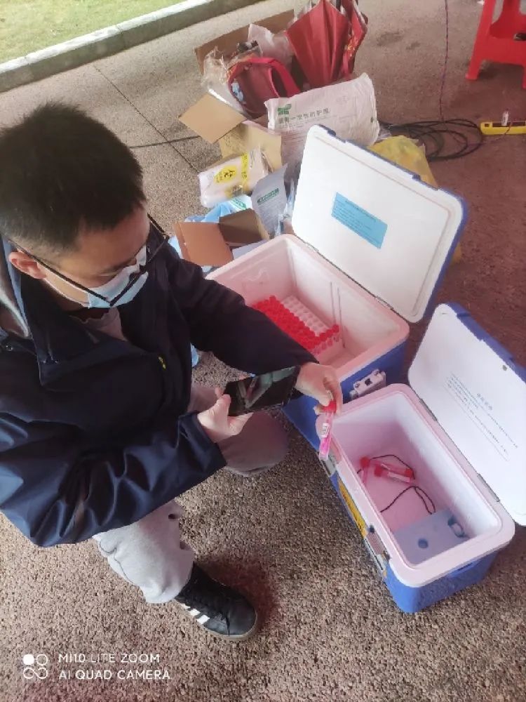 3月21號(hào)在得到社區(qū)的回復(fù)后,我隨即加入了核酸檢測(cè)工作隊(duì)伍,穿上志愿者的防護(hù)服、馬甲、戴上黨徽,哪里工作最苦最累,我就出現(xiàn)在哪里。在檢測(cè)工作中,我主動(dòng)承擔(dān)負(fù)責(zé)打包咽拭子試管工作。首先由醫(yī)護(hù)人員采集咽拭子放入試管中,并轉(zhuǎn)交給我,我再與社區(qū)工作人員一同對(duì)每根試管進(jìn)行掃碼打包,按照采集點(diǎn)分開掃碼封箱,在檢查無(wú)誤后交由送檢人員統(tǒng)一送往檢測(cè)點(diǎn),這項(xiàng)工作極考驗(yàn)細(xì)心和耐心,否則就出現(xiàn)錯(cuò)、亂的問題。