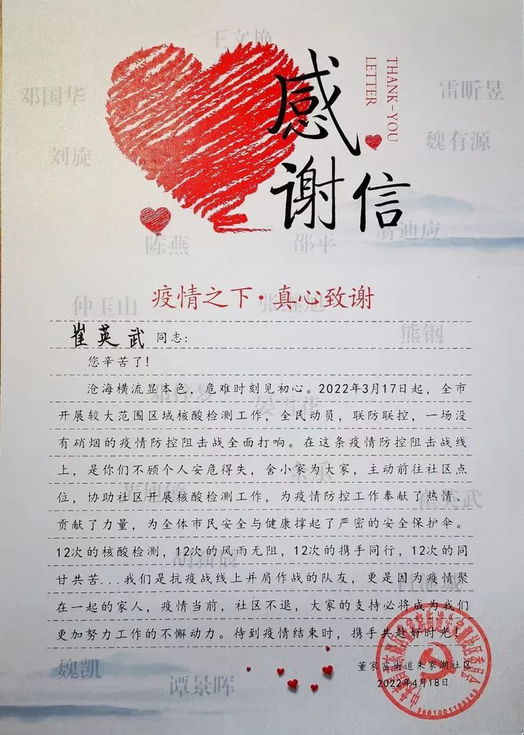 崔英武得知社區(qū)寄來了感謝信的那一刻,他非常意外,讀起感謝信時,之前參與抗疫志愿服務(wù)的畫面又浮現(xiàn)在眼前,他說:“當(dāng)時什么都沒多想,就想著作為一名預(yù)備黨員,我應(yīng)該為抗疫出一份力。現(xiàn)在南昌疫情社會面動態(tài)清零了,回過頭來看,很感慨,也很欣慰,因為所有的辛苦都是值得的。”