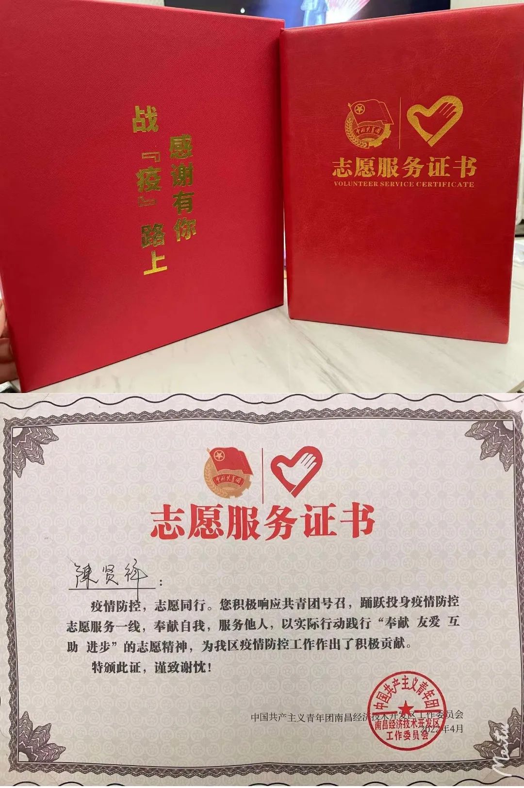 2022年4月30日,贛昌砂石公司宣傳部陳賢祥收到了中國共產(chǎn)主義青年團南昌經(jīng)濟技術(shù)開發(fā)區(qū)工作委員會發(fā)來的志愿服務證書,來信中提到陳賢祥同志,積極響應共青團號召,踴躍投身疫情防控志愿服務一線,奉獻自我,服務他人,以實際行動踐行“奉獻 友愛 互助 進步”的志愿精神,為經(jīng)開區(qū)疫情防控工作作出了積極貢獻。
