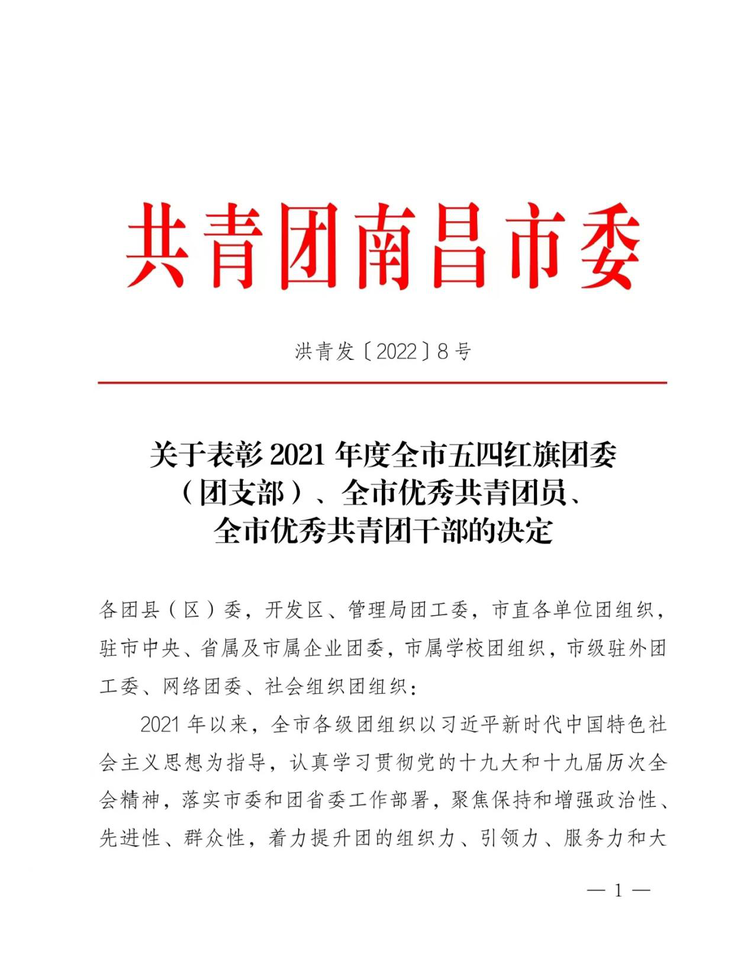喜報(bào) | 贛昌砂石公司團(tuán)總支部書(shū)記胡雯君榮獲2021年度“全市優(yōu)秀共青團(tuán)干部”榮譽(yù)稱(chēng)號(hào)