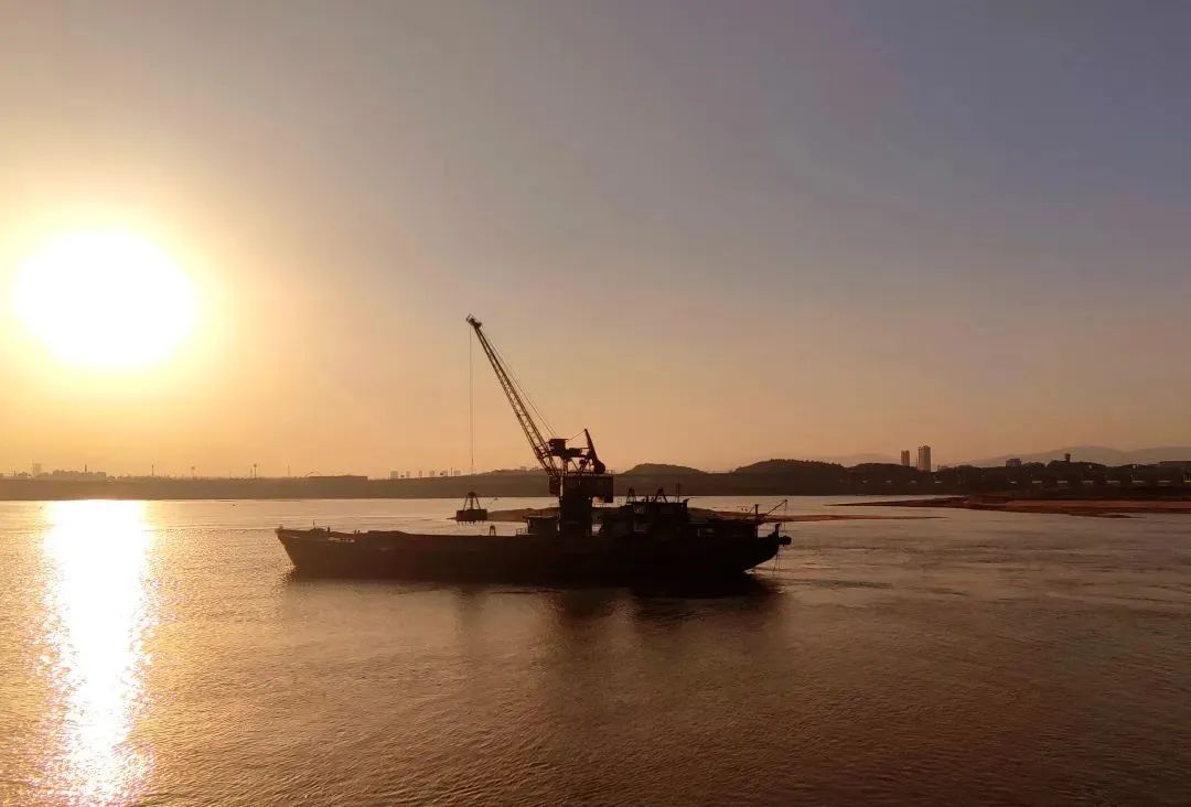 12月14日下午16時,夕陽余暉灑滿江面,贛江主支英雄大橋下游1000米處一艘貨運船正停泊在江心位置,緊挨著的水上浮吊正在有條不紊的作業(yè),它的大臂有節(jié)奏地來回擺動著,伴隨著“轟隆轟隆”的機(jī)械運轉(zhuǎn)聲,底端的抓斗將一袋袋從江里抓起的砂石放進(jìn)貨運船艙,然后又返回河道抓取砂袋……此時,正對著船只的堤岸上一雙疲憊的眼睛始終聚精會神地注視著這里,水上浮吊大臂擺動的頻率正牽動著他的心。