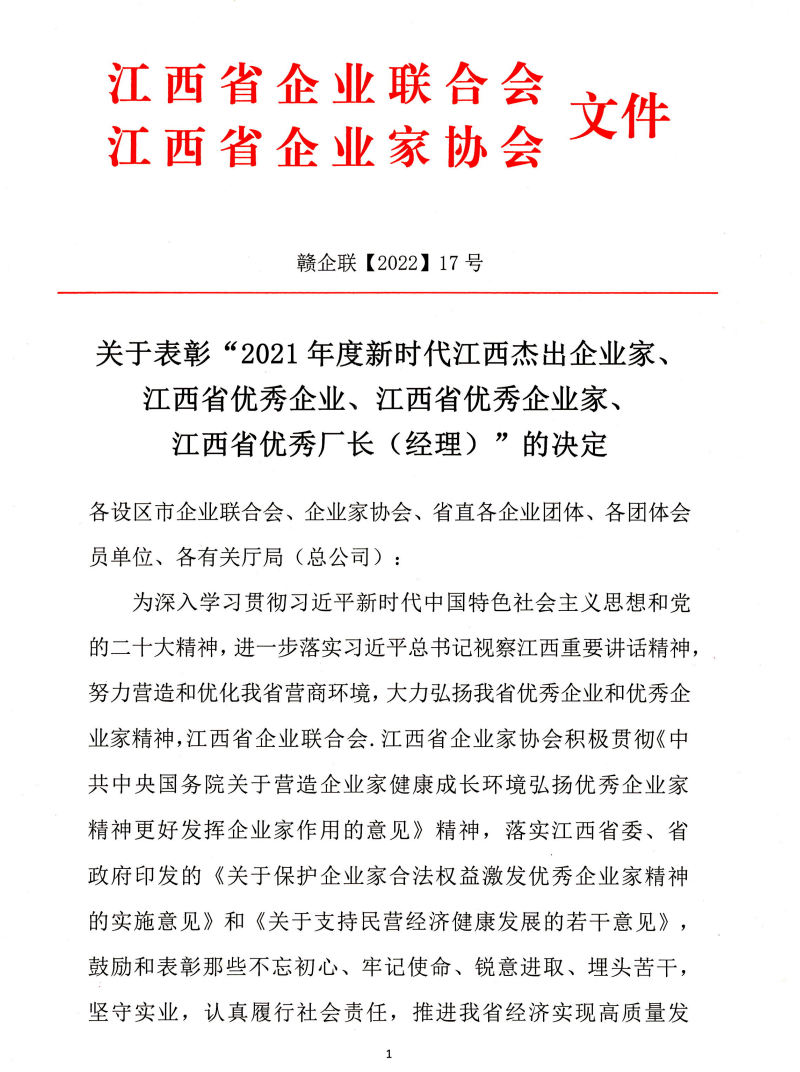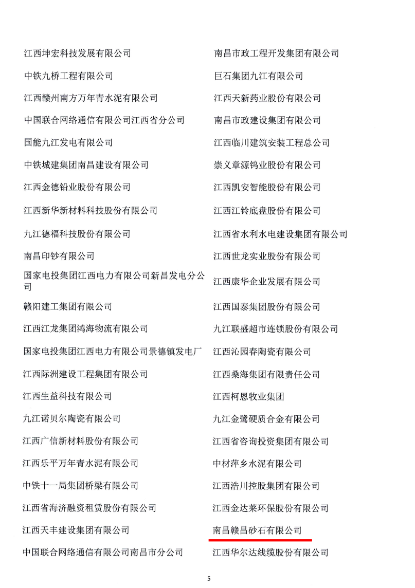 近日,江西省企業(yè)聯(lián)合會(huì)、江西省企業(yè)家協(xié)會(huì)聯(lián)合發(fā)布了《關(guān)于表彰“2021年度新時(shí)代江西杰出企業(yè)家、江西省優(yōu)秀企業(yè)、江西省優(yōu)秀企業(yè)家、江西省優(yōu)秀廠長(經(jīng)理)”的決定》,南昌贛昌砂石有限公司獲評(píng)“2021年度江西省優(yōu)秀企業(yè)”榮譽(yù)稱號(hào)。