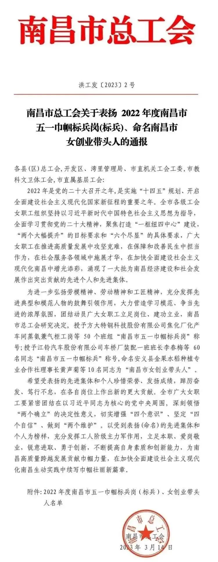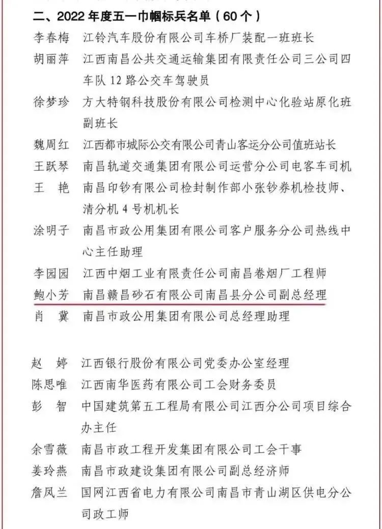 為進一步弘揚勞模精神、勞動精神和工匠精神,充分發(fā)揮先進典型和模范人物的鼓舞引領(lǐng)作用,大力營造學(xué)習(xí)模范、爭當(dāng)先進的濃厚氛圍,團結(jié)動員廣大女職工立足崗位、建功立業(yè),近日,南昌市總工會公布的《關(guān)于表彰2022年度南昌市五一巾幗標(biāo)兵崗(標(biāo)兵)、命名南昌市女創(chuàng)業(yè)帶頭人的通報》文件,其中來自南昌贛昌砂石有限公司鮑小芳同志喜獲“南昌市五一巾幗標(biāo)兵”榮譽稱號,表彰了其深耕一線,管內(nèi)務(wù)、保生產(chǎn)、促發(fā)展,兢兢業(yè)業(yè)不怕苦的奮斗精神,充分展現(xiàn)了南昌贛昌砂石有限公司‘婦女能頂半邊天’的巾幗風(fēng)采。