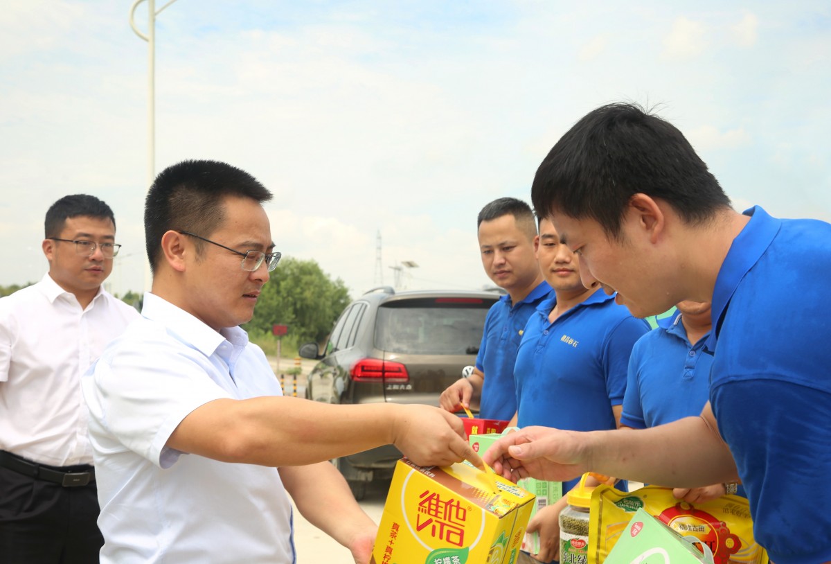 7月26日,南昌交投集團高管,原南昌水投董事、副總經理陳鴻一行赴贛昌砂石公司高新銷售中心尤口砂場看望慰問堅守在一線的職工,為他們送去防暑降溫物資。南昌交投集團黨群工作部副部長李凌清、安全生產部相關人員,贛昌砂石公司黨委書記、董事長唐曉飛,總經理助理葉劍飛等陪同。
