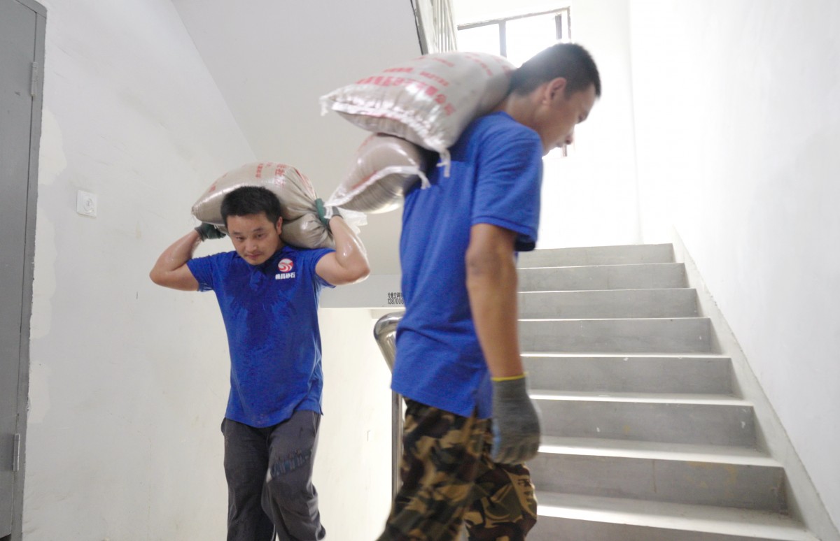 在生產(chǎn)、配送環(huán)節(jié),最辛苦的當屬搬運工師傅們,他們頭頂烈日將車上一袋袋砂石卸到手推車上,再拉進電梯送上樓,按照客戶的要求卸在指定地點,碰到樓梯房配送訂單,則完全要憑借一身體力將砂石一袋袋扛上樓,工作量瞬間要翻好幾十倍,彎腰、直腰、再彎腰、再直腰...每天不知道要重復多少次枯燥而機械、卻又沉重而辛苦的卸貨動作。工作期間,搬運師傅都習慣帶上一塊毛巾放在身上,方便隨時擦汗,一天工作下來,汗水幾乎沒有停過,衣服也沒有干過。“做我們這行,辛苦是辛苦,但是這份工作總得有人做,家里小孩都在上學,老人也要照顧,咬咬牙就堅持下來了”,搬運工師傅笑著說道,話語令人動容,沒有豪言壯語,沒有高談闊論,有的只是對家庭、對工作的無限責任感。