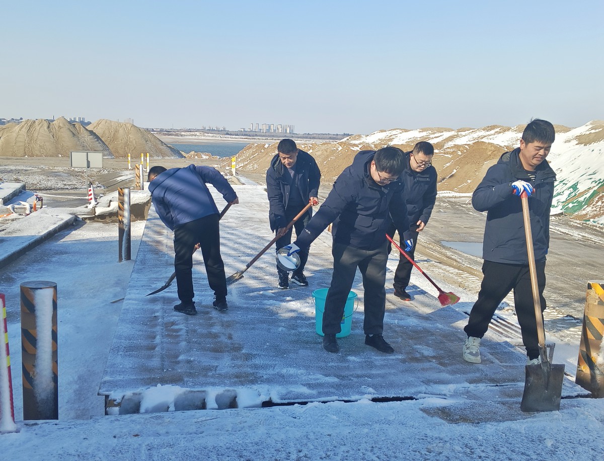 風(fēng)雪中,一雙手套、一件沖鋒衣、一把鐵鍬,砂場職工又開始了一天忙碌的工作,他們在砂場來回穿梭檢查設(shè)備安全、排查安全隱患,清理主要道路、地磅設(shè)備上的積雪,鋪設(shè)草墊及工業(yè)鹽,防止路面打滑,確保車輛安全通行??諘绲纳皥錾蠜]有遮擋物,寒風(fēng)裹挾著沙,直往員工的衣袖里鉆,手凍得直哆嗦,他們沒有一絲抱怨。