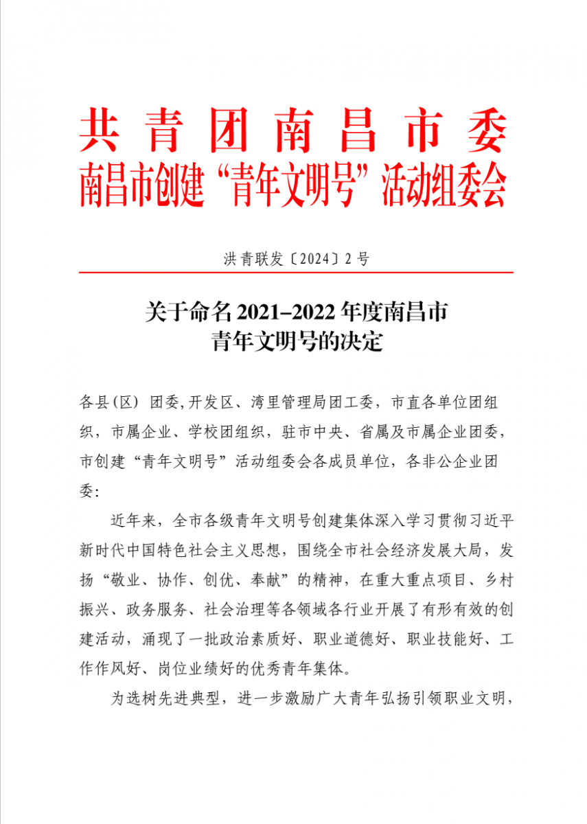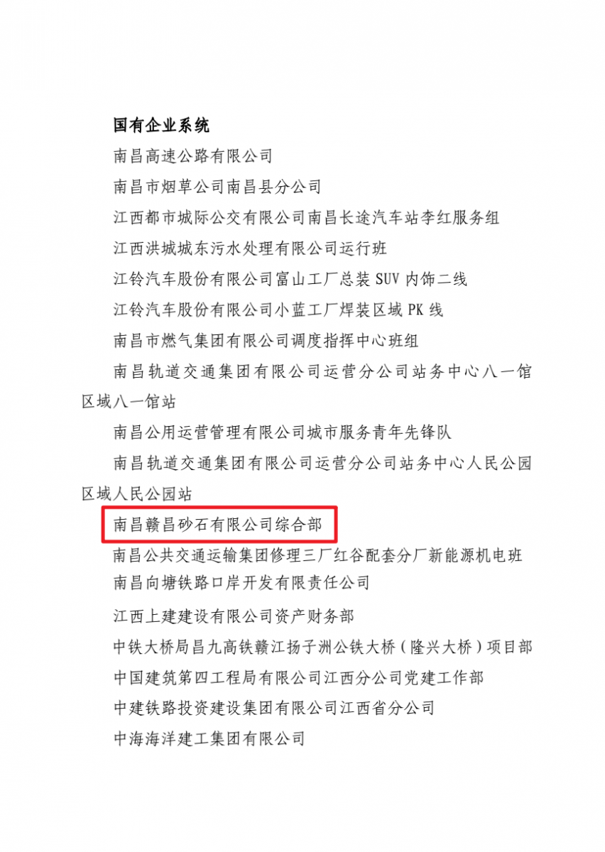 近日,共青團(tuán)南昌市委、南昌市創(chuàng)建“青年文明號”活動組委會印發(fā)了《關(guān)于命名2021—2022年度南昌市青年文明號的決定》,其中,贛昌砂石公司綜合部獲得“南昌市青年文明號”榮譽稱號!