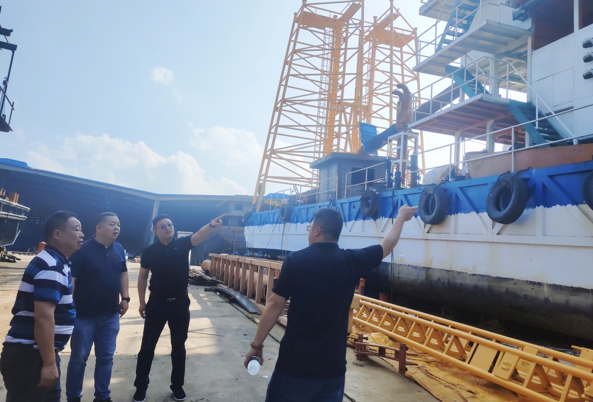 會(huì)后,蔡安煜一行前往湖南桃花江游艇制造有限公司船廠對(duì)該公司建造的采砂船舶進(jìn)行實(shí)地參觀考察。
