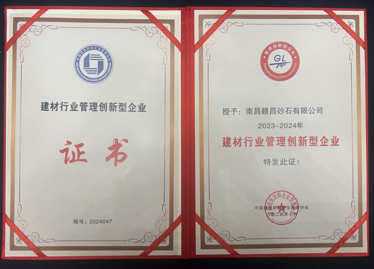 贛昌砂石公司經(jīng)中國建筑材料企業(yè)管理協(xié)會初審、終審,歷時六個月,根據(jù)入選條件和準則,榮獲“2023—2024年建材行業(yè)管理創(chuàng)新型企業(yè)”稱號。