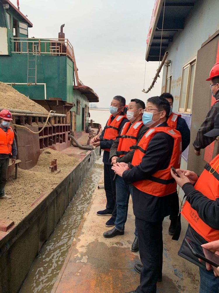 在接受體溫檢測、完成登記之后,吳海勤一行登上采挖船,與采區(qū)現(xiàn)場工作人員深入交流,仔細察看了現(xiàn)場采挖出的砂石質(zhì)量,詳細詢問防疫物資、人員到崗、采挖設(shè)備到位、砂石供應(yīng)等情況,采區(qū)負責人對以上情況進行了詳細匯報。